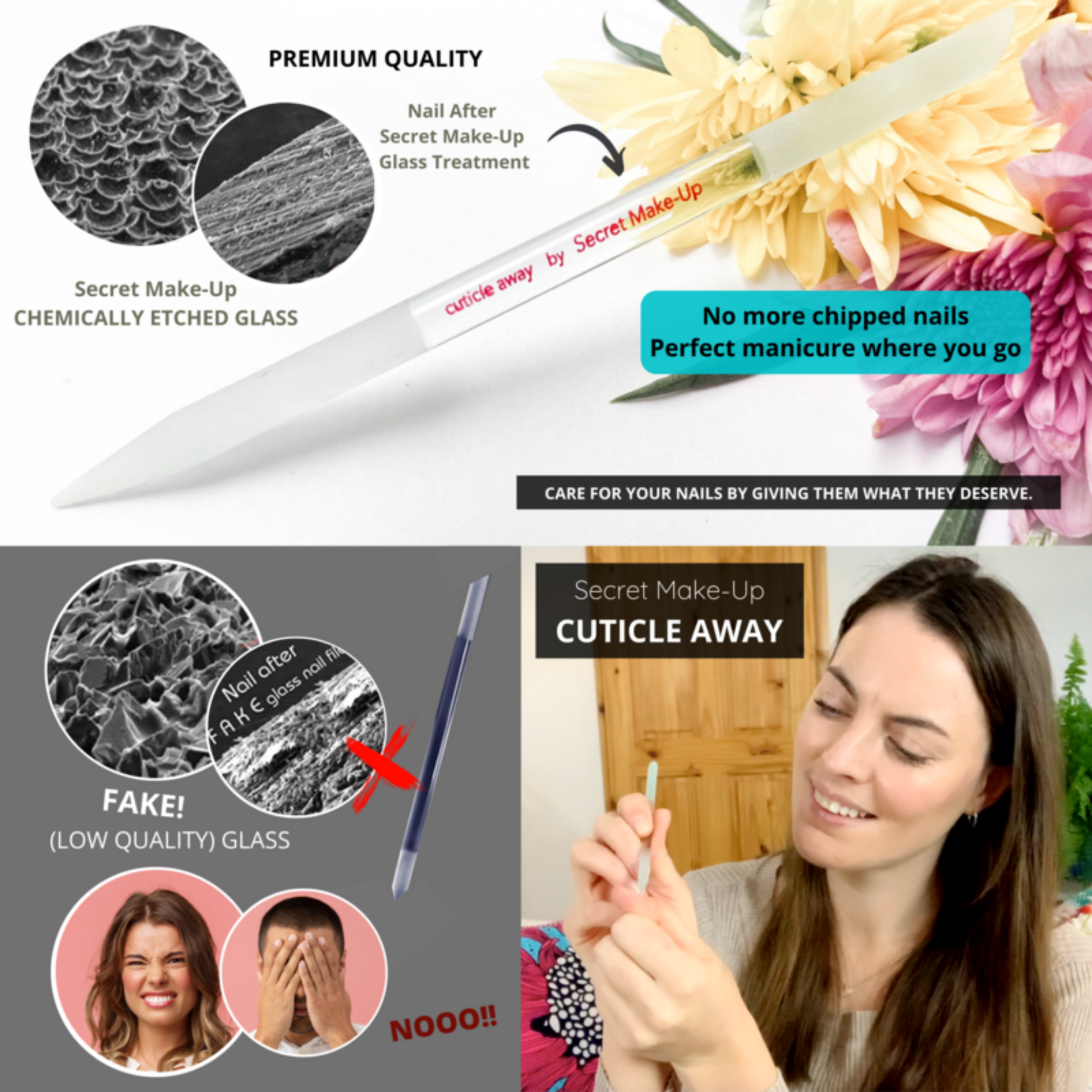 The Cuticle Away is made from permanently etched, premium crystal; 10% rougher than other cuticle sticks. Gentle on the skin but rough enough for an effective clean. One side of the Cuticle Away is shaped as a tilted cylinder while the other is a perfectly sharp point, allowing for maximum efficiency. Simply choose your surface and scrub away!