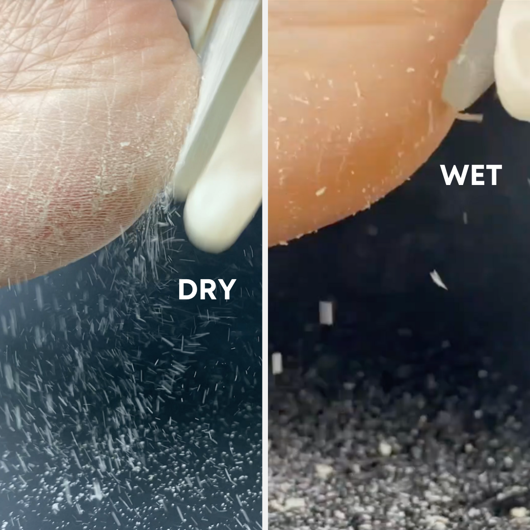 File until the area is soft smooth and free from callus. File Dry = powder/dust. File Wet = soaked dead skin.